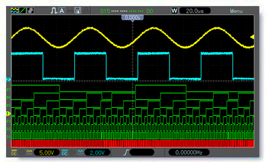 • 4通道數字示波器+8通道邏輯分析儀+25MHz任意/函數信號發生器+12位字發生器