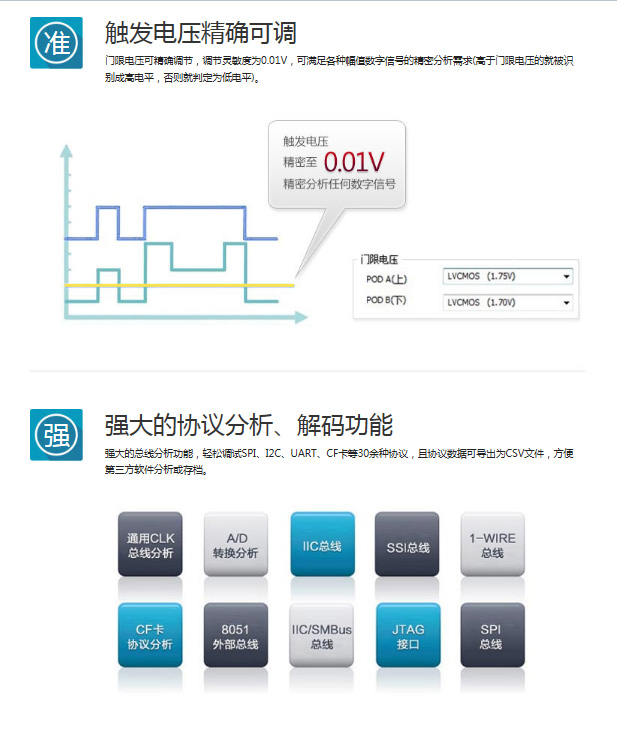 | 協議分析 | 計算機外設CF卡協議分析 IC接口8051外部總線分析 A/D轉換分析通用CLK總線分析 IIC總線1-WIRE總線IIC/SMBus總線SPI總線SSI總線UART(RS-232C/422/485) 存儲器SD卡SPI模式協議分析I²CSPI 光電7段數碼管LCD12864總線分析LCD1602總線分析LED矩陣分析 紅外線NEC紅外傳輸協議分析PT2262波形分析Philips RC-5 Philips RC-6 無線通訊雙相曼徹斯特編碼分析變形彌勒編碼分析 Wiegand 其他Modbus協議分析PCF8591分析DS1302分析別名表 | 計算機外設CF卡協議分析 PS/2 IC接口8051外部總線分析 A/D轉換分析通用CLK總線分析 IIC總線1-WIRE總線IIC/SMBus總線SPI總線SSI總線UART(RS-232C/422/485)SPI Compatible 存儲器SD卡SPI模式協議分析SD卡SD模式I²CSPI 光電7段數碼管LCD12864總線分析LCD1602總線分析LED矩陣分析KNX協議 紅外線NEC紅外傳輸協議分析PT2262波形分析Philips RC-5 Philips RC-6 電源PMBus