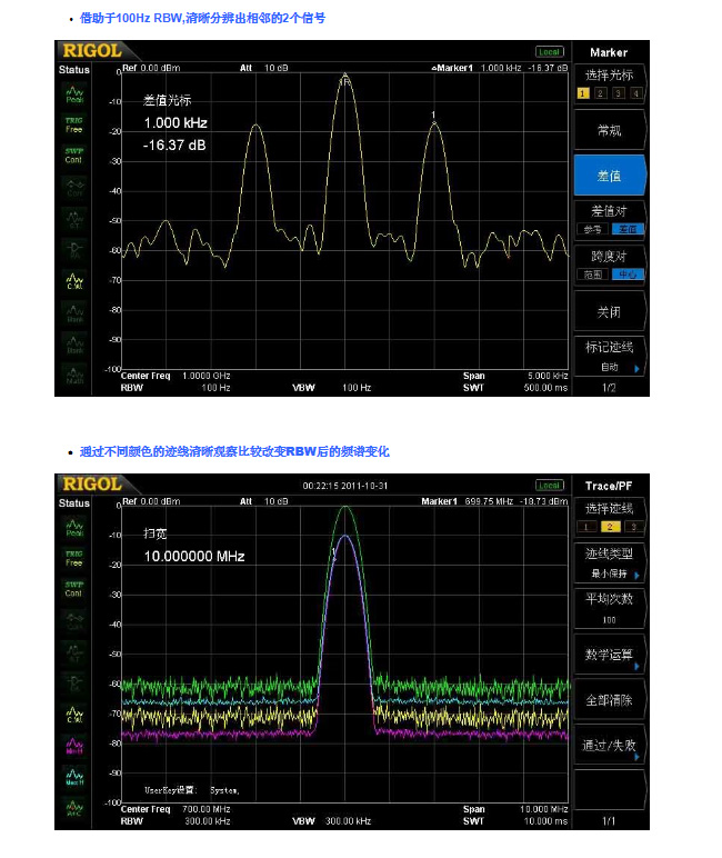 可以分辨更近的信號(hào):通過實(shí)現(xiàn)更窄的RBW,可以分辨出相差10Hz的兩個(gè)信號(hào)。