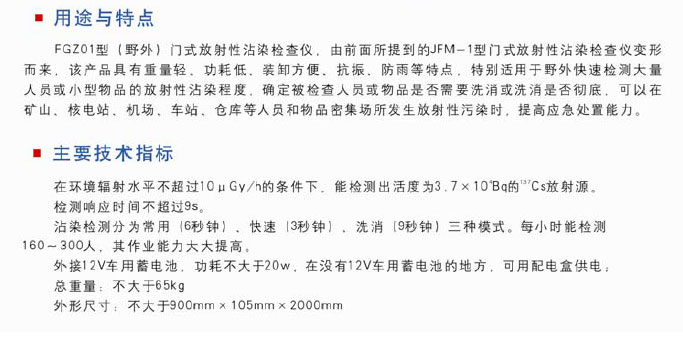 (野外)門式放射性沾染檢查儀,在環境輻射水平不超過10μGy/h的條件下能檢測出3.7x104Bq的放射源(Cs-137),檢測響應時間≦9s,三種沾染檢測模式常用(6s)、快速(3s)、洗消(9s),每小時檢測人數160~300人。