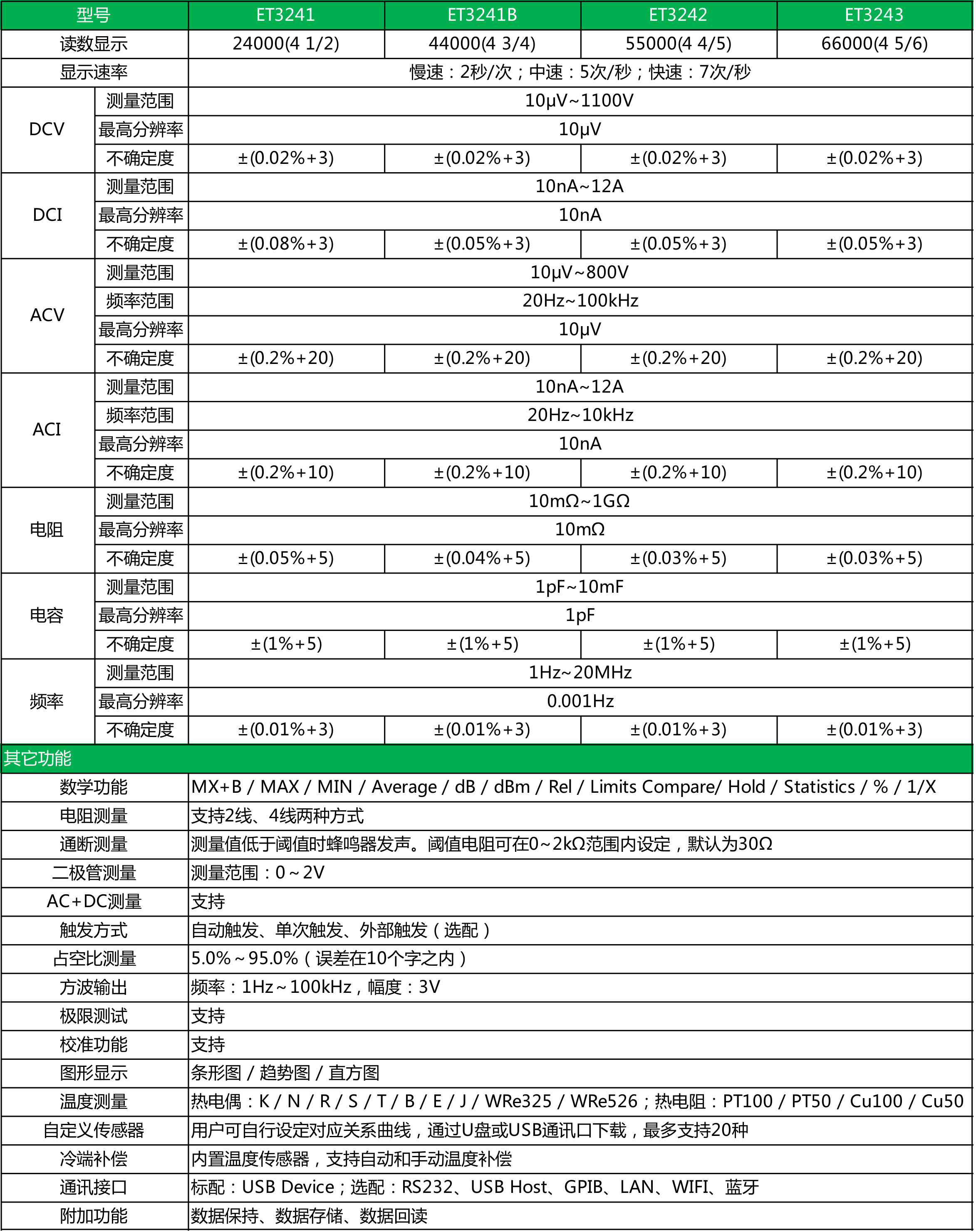 臺式萬用表,4 1/2位分辨率(19999計數),精度±0.02%讀數+3(最低有效數位),電壓、電流、電阻、周期、頻率、電容、溫度、二極管、通斷測量,方波輸出、占空比測量功能,實時曲線、直方圖、條形圖等,3.5"顯示屏,USB接口。