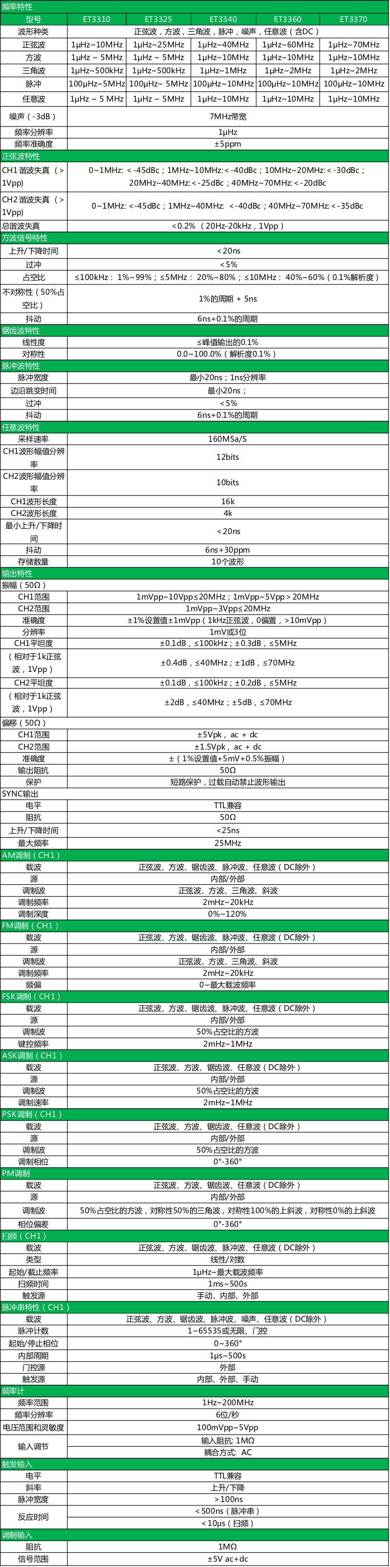 ● 雙通道輸出,最高輸出頻率:ET3310為10MHz、3325為25MHz、3340為40MHz、3360為60MHz、3370為 70MHz