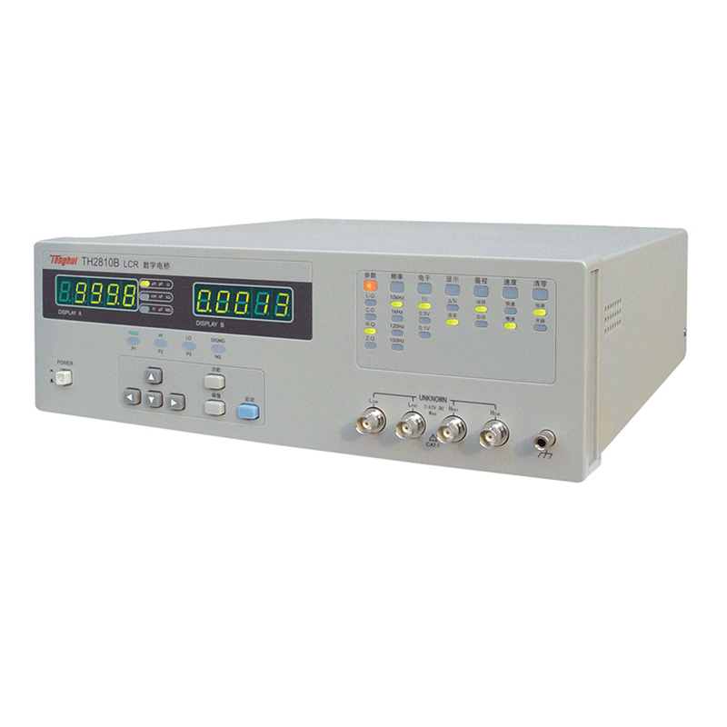 TH2810B型LCR數字電橋是一種測試速度快、精度高、測試范圍寬的通用阻抗測量儀器。 四個測試頻率點,最高至 10 kHz, 30 Ω 、100 Ω兩種不同信號源輸出阻抗可使儀器測量結果與眾多LCR結果相一致,同時也能適應陶瓷電容器對測量電平的要求?蓾M足生產線質量保證、進貨檢驗的測量要求。 技術參數