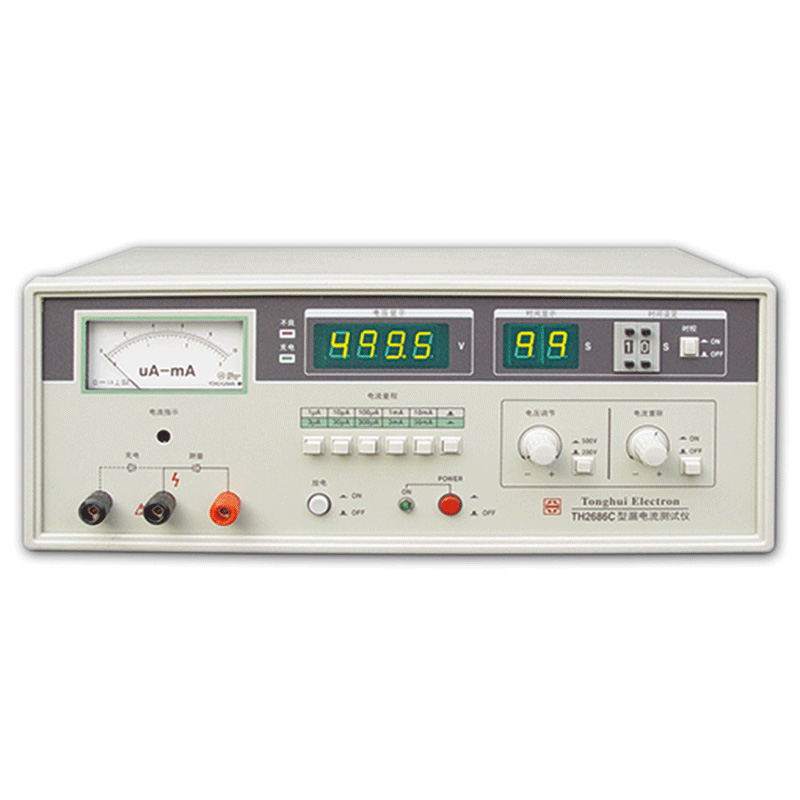 TH2686C型電解電容漏電流測試儀是一種能自動測量電解電容漏電流參數的測試 儀器。測試電壓連續可調。電壓值、充電時間數字顯示,電流值表針指示,充電 — 測試自動轉換。具有電流超限指示,測試速度快,操作方便,安全可靠等特點。適用于生產線的質量保證及進貨檢驗。