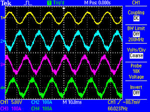 為在交流線路電壓上進行測量及檢查其對電源失真系統(tǒng)的影響,電源分析應用軟件顯示了直到 50 階諧波的諧波成分,提供了相位、無功功耗和功率因數(shù)測量功能。通過四通道 TPS2014B 或 TPS2024B,可觀察三相電壓或電流。